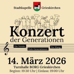 Wir laden sehr herzlich zu unserem einzigartigen Frühjahrskonzert am Samstag, 14. März 2026, in die Turnhalle des BORG Grieskirchen ein. Unter dem Motto „Konzert der Generationen. Ein Verein. Viele Generationen. Ein Klang.“ vereinen wir unter der musikalischen Leitung von Kapellmeisterin Julia Bonelli aktive mit ehemaligen Musizierenden sowie Jungmusiker an einem Konzertabend.